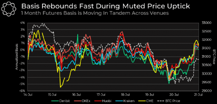 „Celkovo je vytvorenie futures kontraktov na burze CME považované za býčí útok, vzhľadom na to, že Bitcoin práve ukončil svoju krátkodobú seansu po newyorskej mini pumpe. Ako už bolo uvedené, báza futures na CME dosiahla záporné hodnoty. Všetky údaje poukazujú na to, že ľudia nakupujú futures kontrakty v období, kedy sa Bitcoin pohybuje na nižších priečkach.”