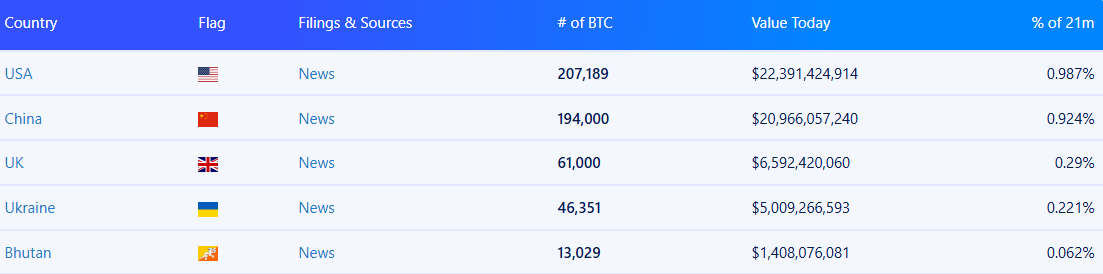 Podľa najnovších údajov z februára 2025 drží USA približne 207 189 BTC v hodnote približne 22,36 miliardy dolárov, čo predstavuje 0,987 % celkovej ponuky Bitcoinu. Čína nasleduje s 194 000 BTC (0,924 %), Spojené kráľovstvo s 61 000 BTC (0,29 %) a Ukrajina s 46 351 BTC (0,221 %). Ďalšie krajiny ako Bhután, El Salvador, Fínsko a Gruzínsko majú menšie množstvá, ukazujú údaje Bitbo.