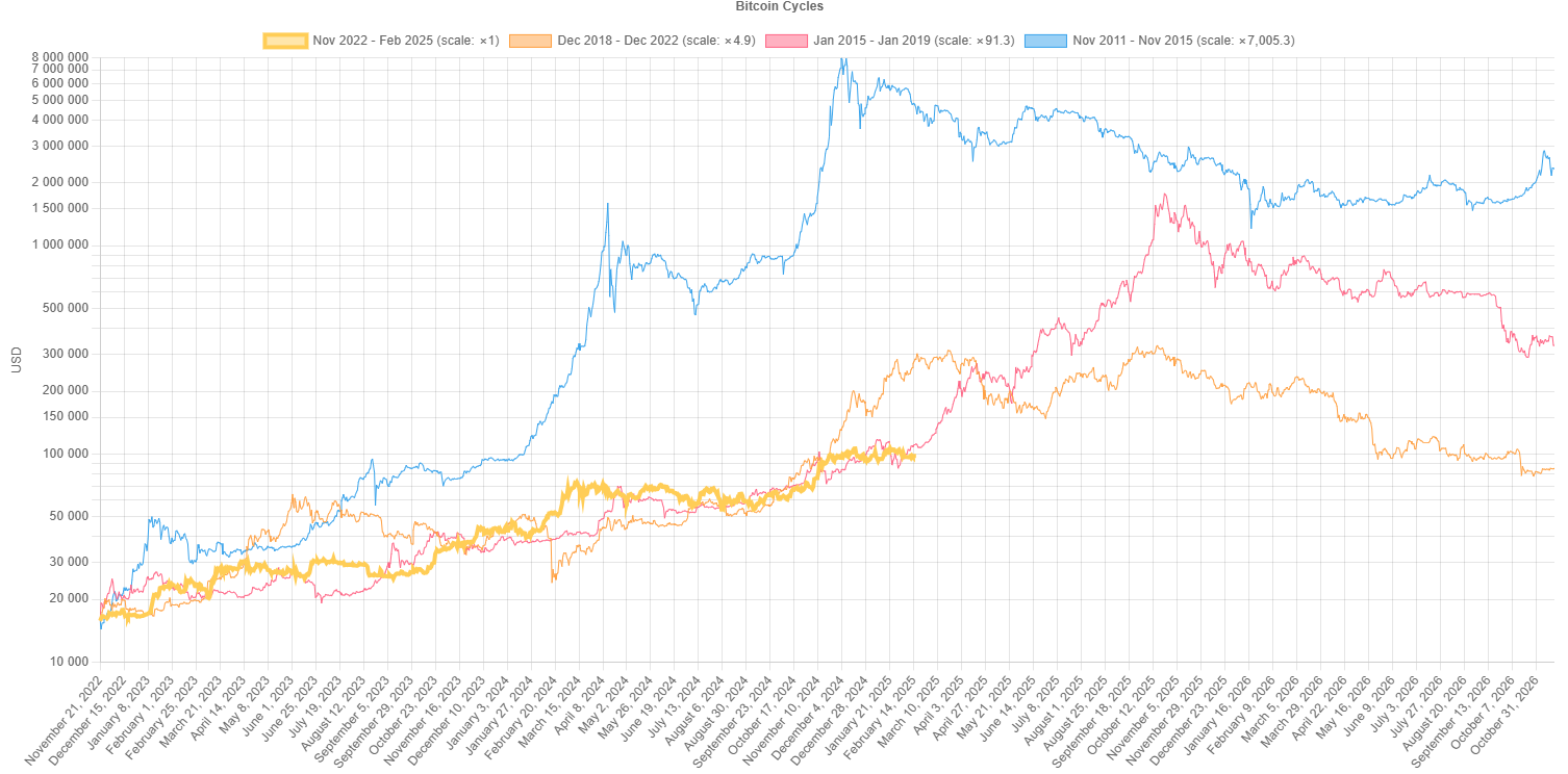 Bitcoin ešte má kde stúpnuť. Zdroj: bitcoincyclescomparison.com
