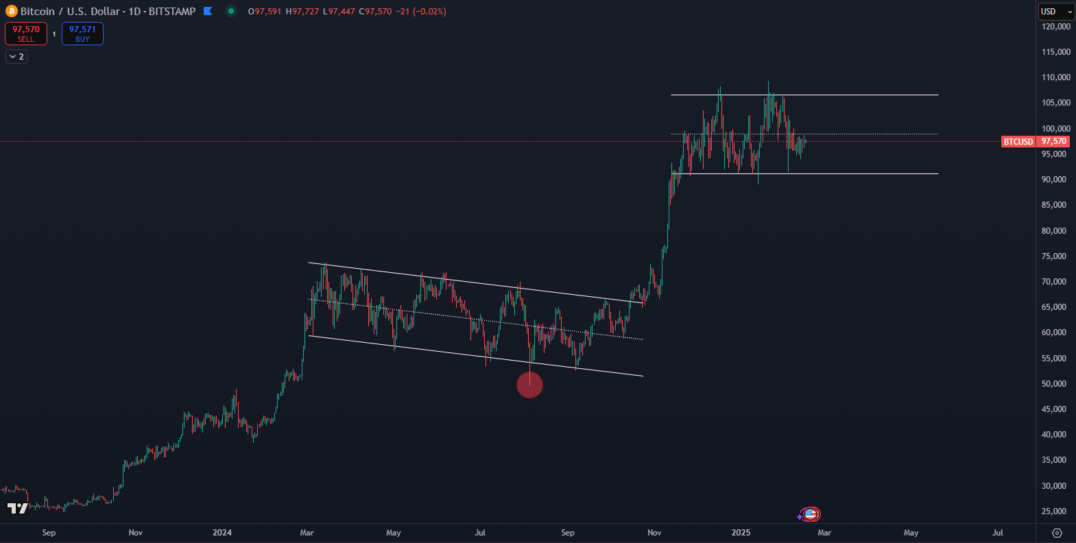 Bitcoin v roku 2024 od marca do septembra formoval podobnú štruktúru, no vtedy sme boli dokonca svedkami mierneho poklesu. V súčasnosti podľa údajov TradingView od polovice novembra cena stagnuje v spomínanom pásme. Preto je vysoká pravdepodobnosť, že sa história zopakuje a po ukončení stagnácie príde ďalší vzostup.