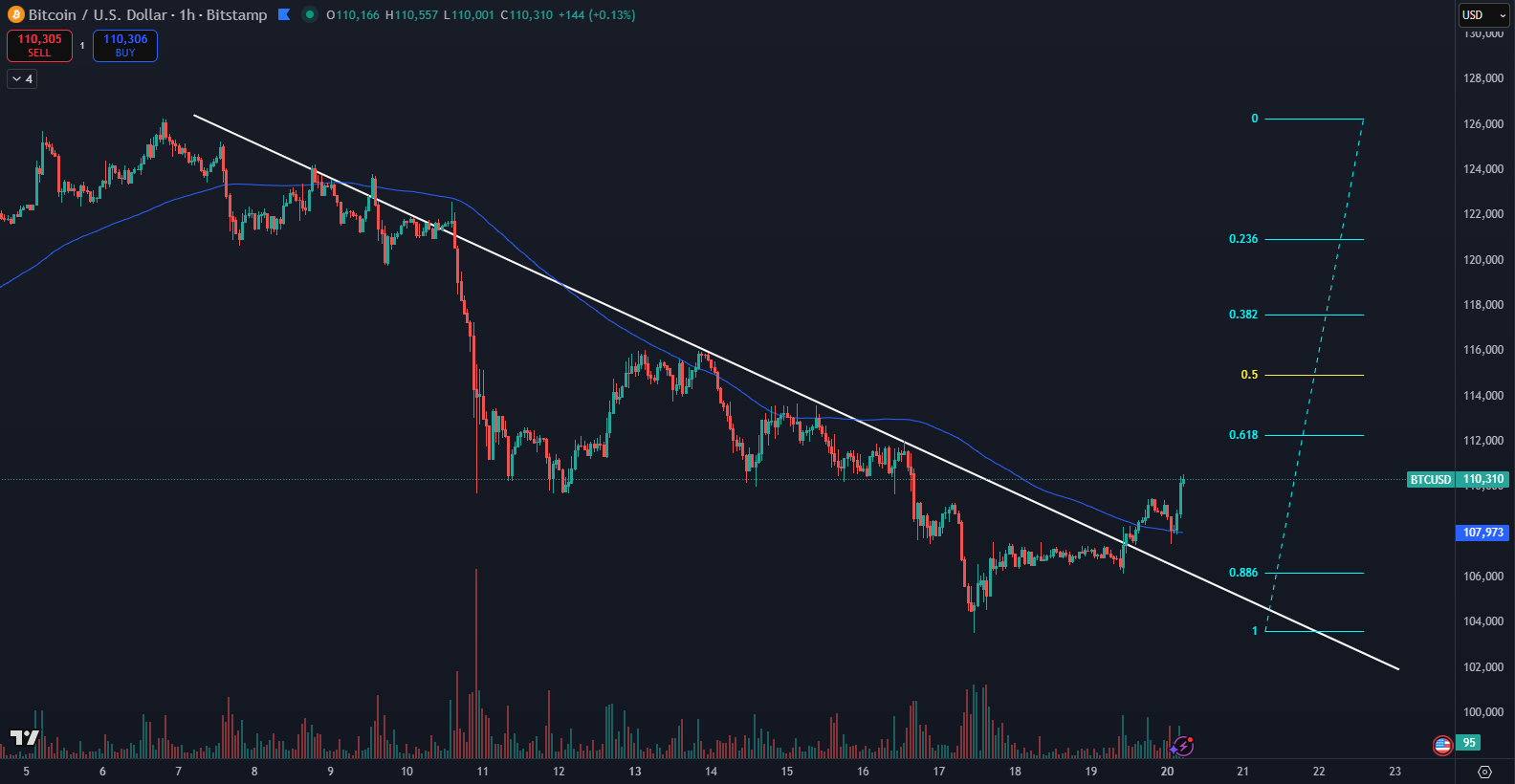Na grafe sa objavil zlom nad klesajúcou trendovou líniou, ktorá mala odpor približne pri 107 500 dolároch (biela línia). Tento pohyb umožnil Bitcoinu posunúť sa späť nad hranicu 110 000 dolárov. Cena zároveň vystúpila nad 100-hodinový jednoduchý kĺzavý priemer (modrá krivka), čo naznačuje prvé známky možného oživenia. Posledné krátkodobé minimum dokonca tento kĺzavý priemer otestovalo ako support.