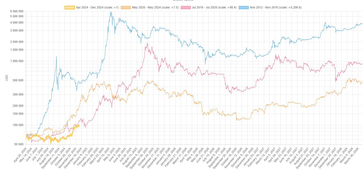 Porovnanie cyklov BTC medzi halvingami. Zdroj: Bitcoin Cycles Comparison