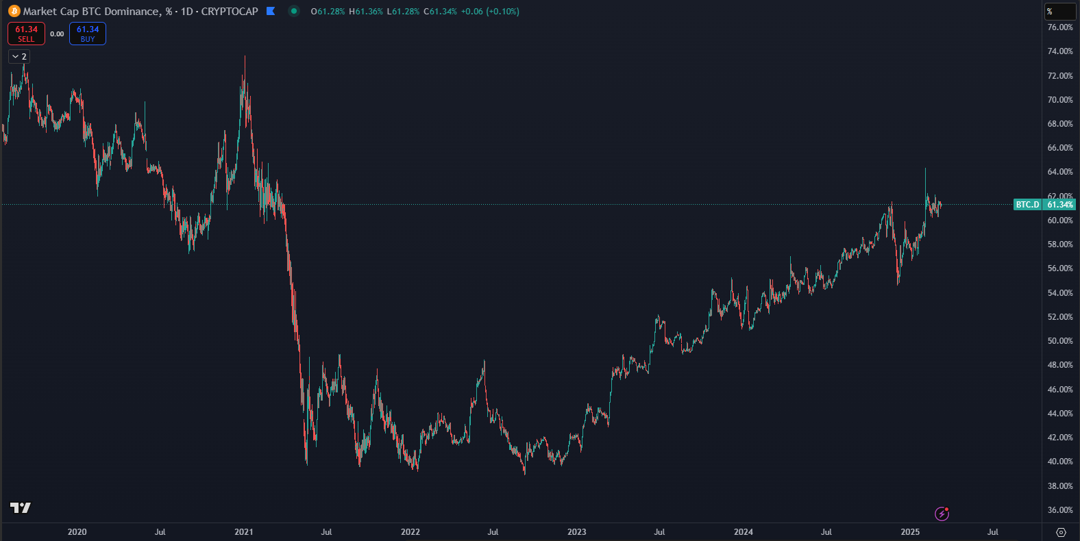 Zatiaľ čo cena Bitcoinu klesá, jeho dominancia na trhu rastie. Tento trend naznačuje, že investori hľadajú bezpečie v najväčšej kryptomene, keďže altcoiny klesajú rýchlejšie ako Bitcoin. Historicky platí, že keď Bitcoin vedie trh smerom nadol, jeho dominancia rastie.