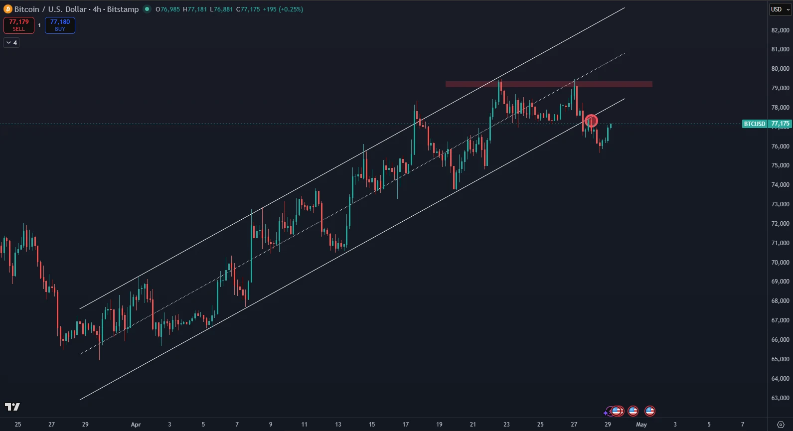- Kľúčové rozhodnutie nastane pri trendovej línii — návrat do vlajky otvára cestu na 80 000 dolárov.