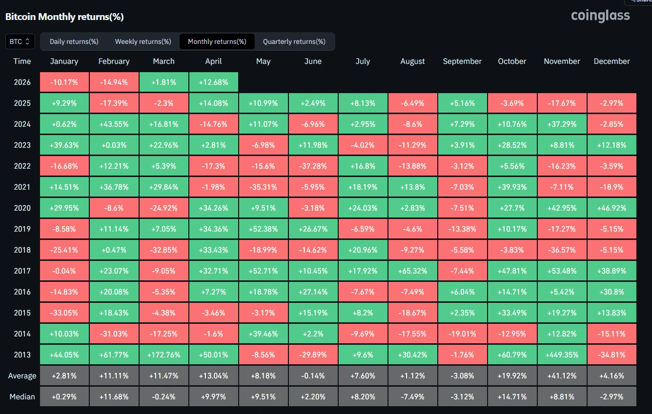 - Apríl 2026 sa stáva najziskovejším mesiacom Bitcoinu za posledný rok s rastom 12,68 %.