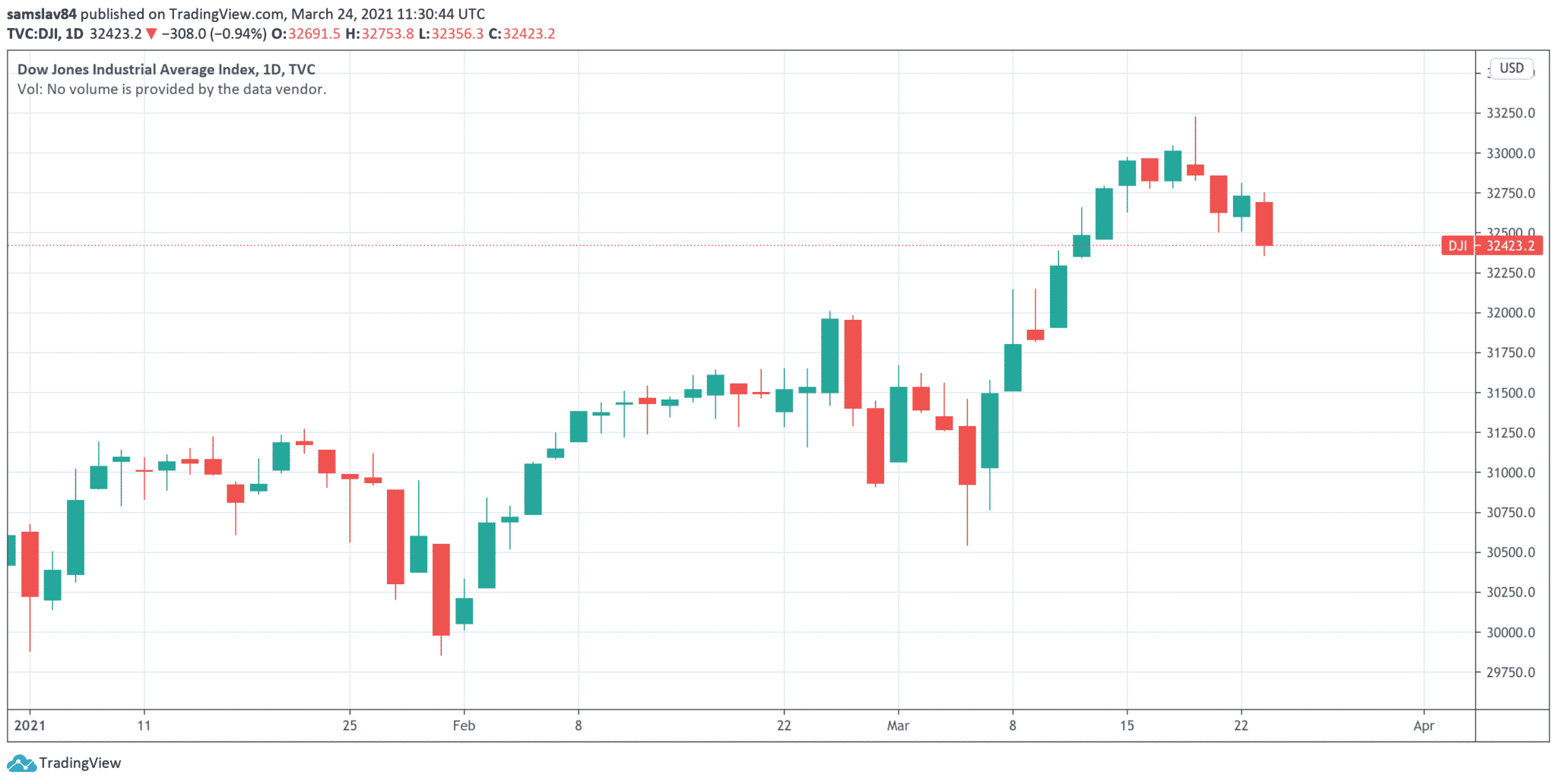 Včera klesol na 53 000 dolárov a po otvorení búrz padli aj akcie. Index S&P 500 má za sebou pokles o 0,76%, Dow Jones padol o 0,94%.