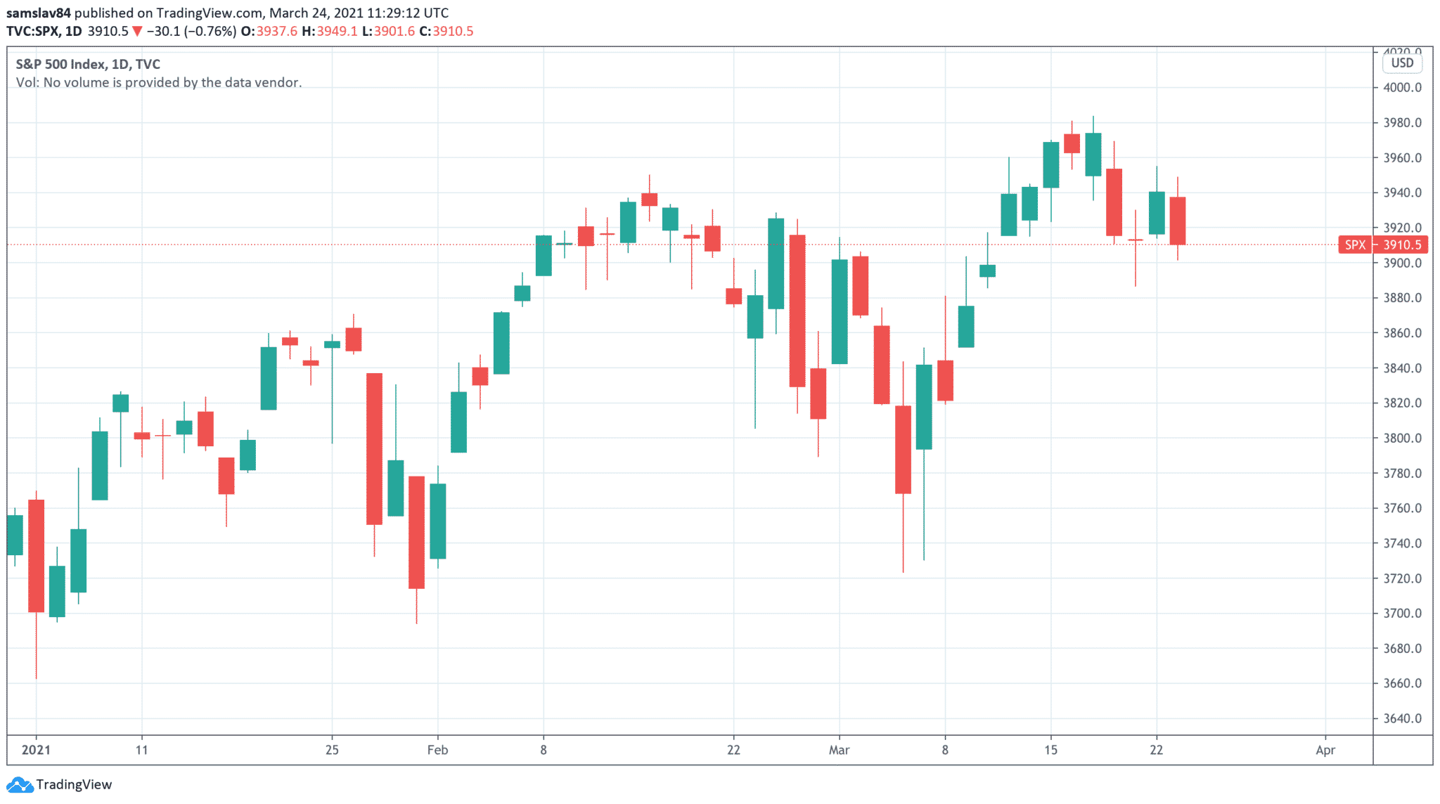 Konsolidácia Bitcoinu okolo hladiny vyznačenej zelenou čiarou trvá už viac než dva týždne. Bude zaujímavé sledovať, ako dlho to ešte potrvá a kedy začne na kryptomeny pôsobiť americký ekonomický stimulus vo výške 1900 miliárd dolárov.