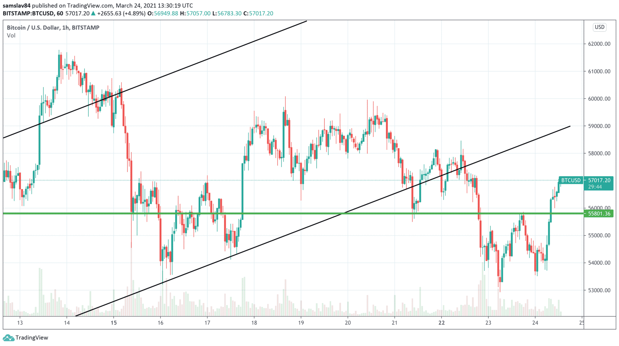 Trh s kryptomenami v posledných hodinách slušne stúpol. Bitcoin spravil viac než 3000 dolárov. Zo včerajšieho lokálneho minima 53 000 USD je to dokonca 4000 dolárov. Reakcia trhu na včerajší pokles pod support je celkom jasná. Býci opäť preberajú kontrolu. Ak Bitcoin udržia nad podpornou hladinou 56 000 dolárov, bude to veľmi dobré znamenie.