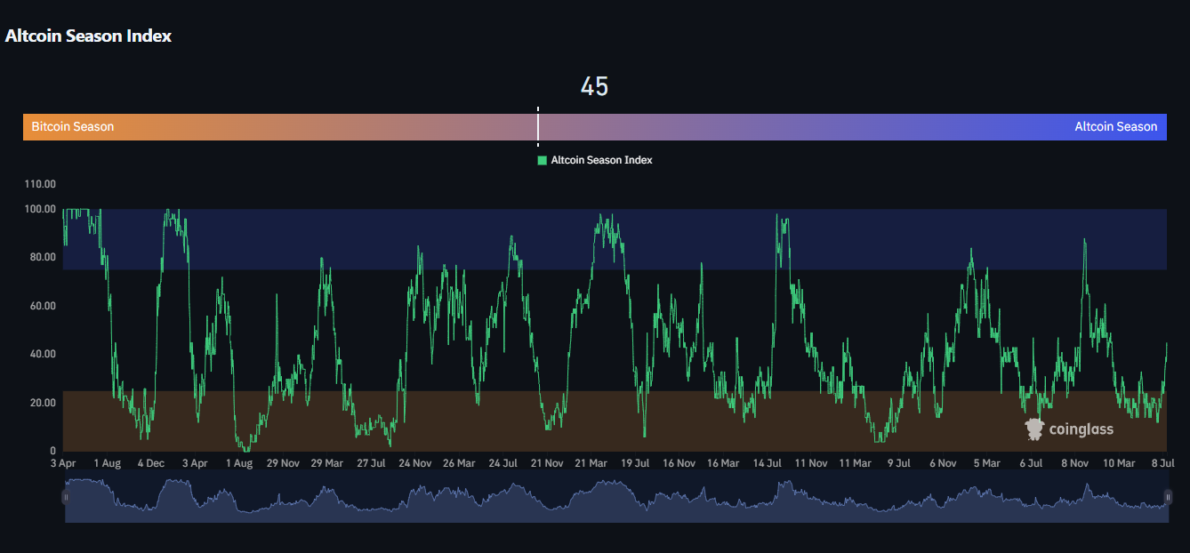 Altcoinový trh v posledných cykloch nasleduje Bitcoin s určitým oneskorením. Je teda možné, že altcoinová sezóna ešte len príde. Indikátor „Altcoin Season Index” od platformy Coinglass ukazuje hodnotu 45 bodov. Tento index dosahuje maximálnu hodnotu 100 a podľa metodiky tvorcov sa za altcoinovú sezónu považuje stav, keď viac než 75 % z top 50 altcoinov prekonáva za posledných 90 dní výkon Bitcoinu. V súčasnosti je to však len približne polovica.