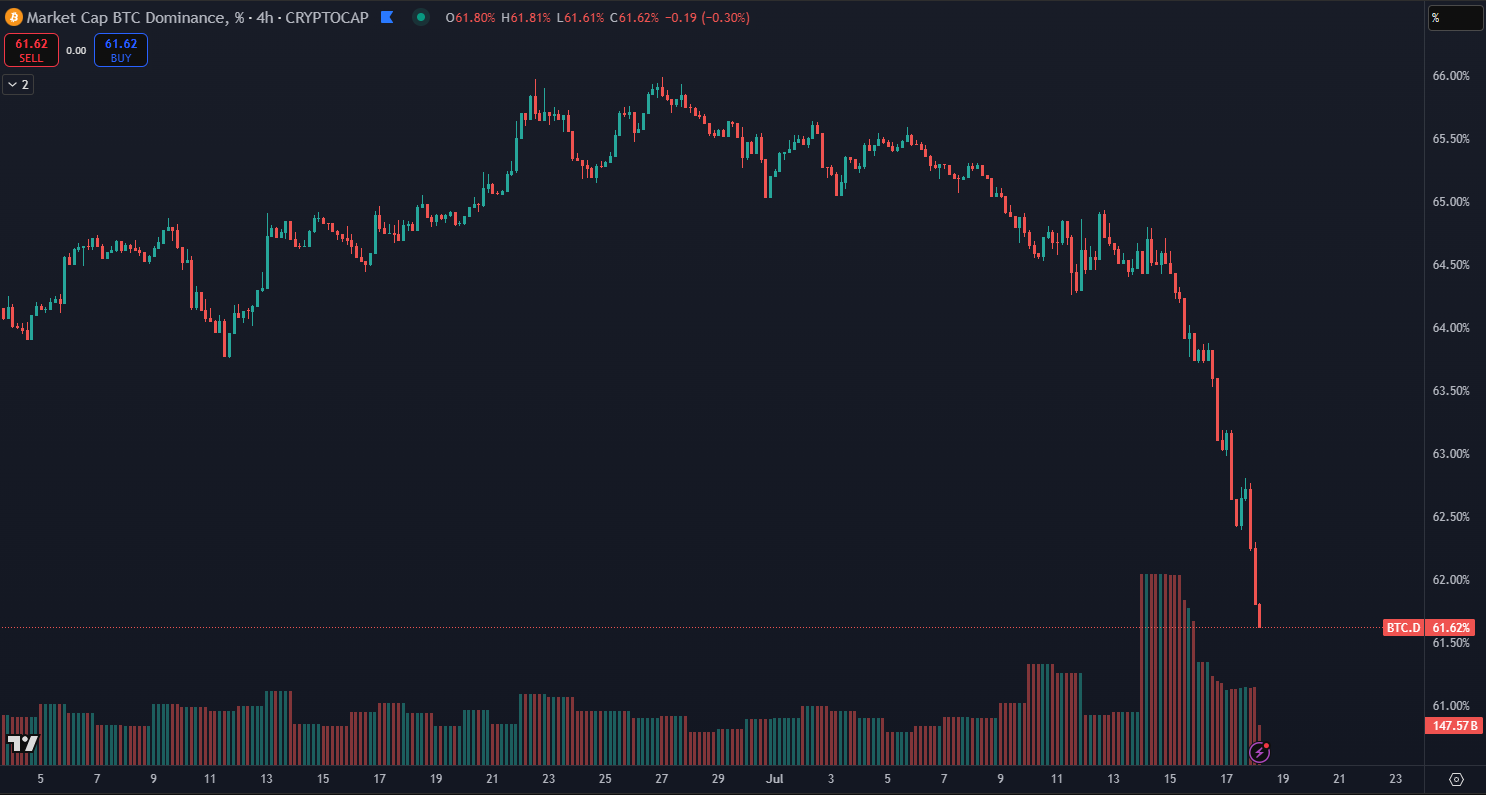Bitcoin dominuje aj napriek poklesu dominancie zo 66 % na 61,5 %, pretože altcoiny sa stále obchodujú výrazne pod svojimi maximami. Tento stav je spôsobený opatrnou náladou investorov, silným inštitucionálnym záujmom o Bitcoin a rastúcimi reguláciami, ktoré zasahujú predovšetkým altcoinový sektor.