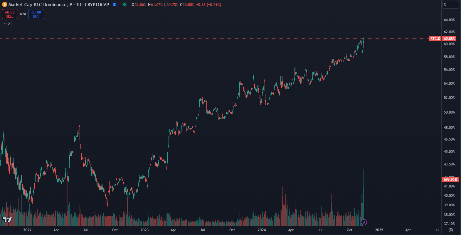 Dominancia Bitcoinu je najvyššia od marca 2021. Zároveň už dva roky bez prestávky graf stabilne rastie a prekonáva nové maximá. Takýto dlhý vzostup sme ešte nikdy nevideli, a to predovšetkým v období, keď denne vznikajú desiatky nových mincí. Práve to, že vzniká mnoho nových kryptomien bez hodnoty, znamená, že väčšina altcoinov nestíha rásť za Bitcoinom.