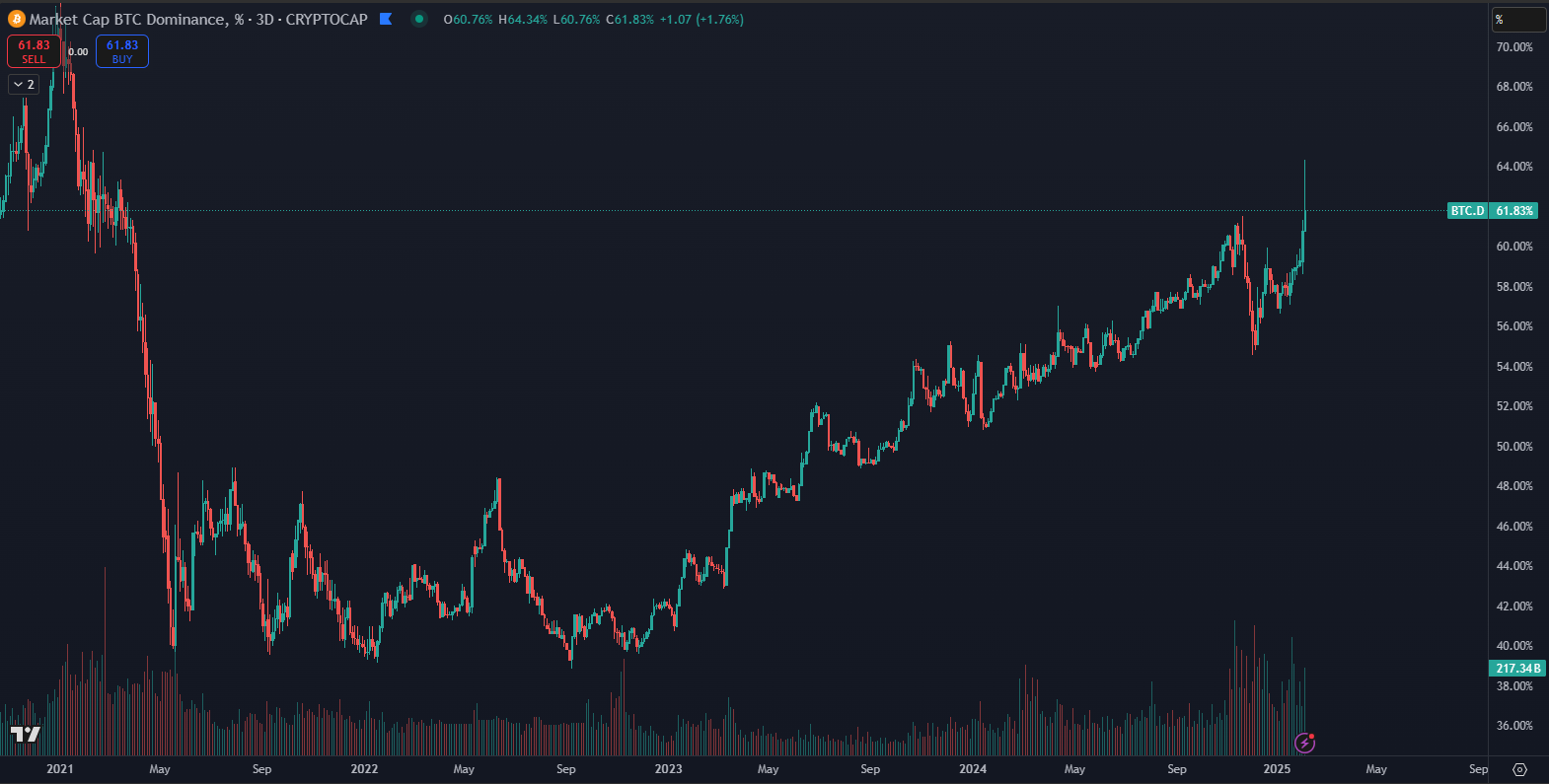 Dominancia BTC stúpla takým tempom, aké sme nevideli roky. Dokonca bolo prekonané 4-ročné maximum na úrovni viac ako 64 %. K nárastu došlo nie len počas korekcie, ale aj počas odrazu cien. Za dva dni sme tak mohli sledovať jasné kraľovanie Bitcoinu, na ktorý sa nechytá žiadny altcoin.