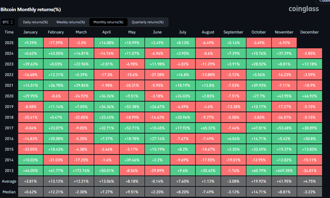 Podľa údajov CoinGlass dosahuje Bitcoin priemerné novembrové zhodnotenie 41,95 %. Avšak tento priemer výrazne ovplyvňuje rok 2013, keď cena Bitcoinu vystrelila o neuveriteľných 449,35 % za jediný mesiac. Takýto prudký nárast bol výsledkom raného štádia trhu, nižšej kapitalizácie a vysokej volatility, ktoré dnes už nie sú bežné.