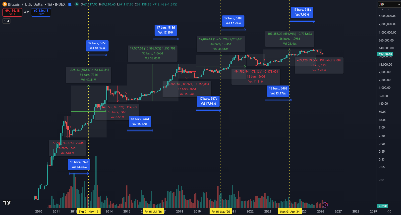 Tento scenár sa totiž neobjavuje náhodne. Ak sa pozrieme na historické dáta a halvingové cykly podľa údajov TradingView, zistíme, že podobná situácia nastáva približne raz za 4 roky. Práve teraz sa nachádzame v bode, ktorý história definuje ako ideálny čas na pravidelné dokupovanie.