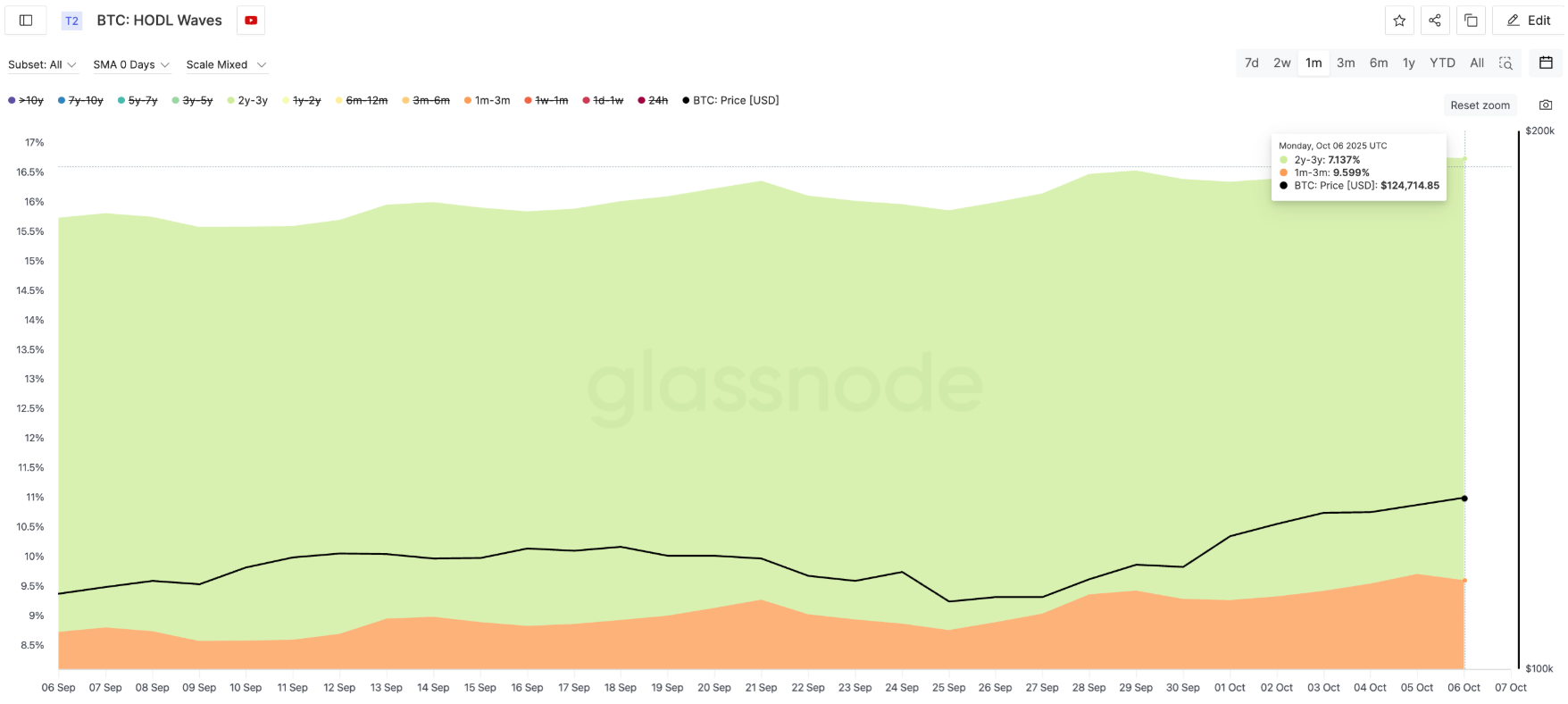 Analýza metriky HODL Waves od Glassnode ďalej odhaľuje, že v poslednom mesiaci svoje pozície rozšírili obe skupiny investorov. Podiel krátkodobých držiteľov (1–3 mesiace) vzrástol z 8,75 % na 9,59 % celkovej ponuky, zatiaľ čo dlhodobí investori (2–3 roky) sa zvýšili zo 7,00 % na 7,13 %.