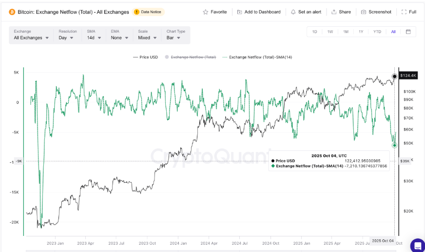 Hlavným cieľom sa podľa údajov TradingView stáva úroveň 130 000 dolárov, ktorú potvrdzujú technické vzorce aj údaje z blockchainu. Zreteľným znakom dôvery investorov je aj vývoj exchange net flow, teda rozdielu medzi počtom mincí vstupujúcich a opúšťajúcich burzy. Negatívna hodnota znamená, že viac Bitcoinu sa vyberá, než ukladá, čo obvykle poukazuje na akumuláciu.