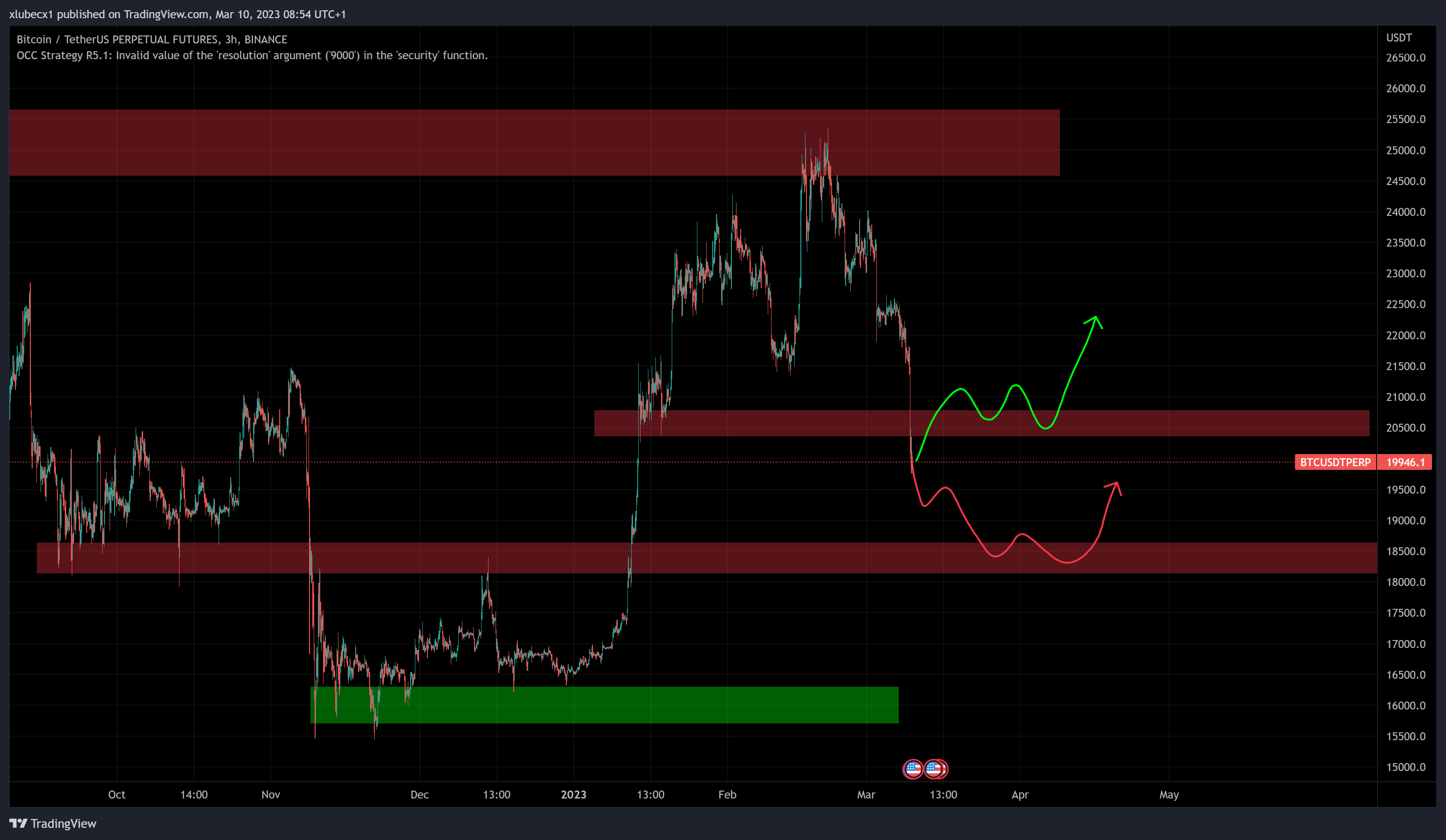 Bitcoinu navyše „pomohol” krach veľkej kryptomenovej banky Silvergate, ktorá ohlásila, že pôjde do likvidácie. O udalosti sme informovali včera. Cena najznámejšej kryptomeny sa prepadla na 20 000 dolárov. Na tejto hladine sa nachádza dlhodobý silný support, na ktorý bitcoin môže reagovať a dokonca sa od neho odraziť. Vzhľadom ale na pretrvávajúcu paniku na trhoch je pravdepodobný aj pokles nižšie.