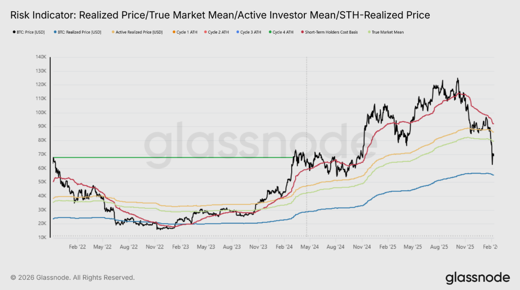Podľa analytických dát Glassnode sa trh nachádza v tretej fáze cyklu, kde cena osciluje medzi tzv. realizovanou cenou okolo 55 000 dolárov a úrovňou True Market Mean (férovou cenou BTC) približne na 79 200 dolároch. Toto rozpätie vytvára koridor, v ktorom sa cena prirodzene pohybuje, kým investori postupne absorbujú ponuku.