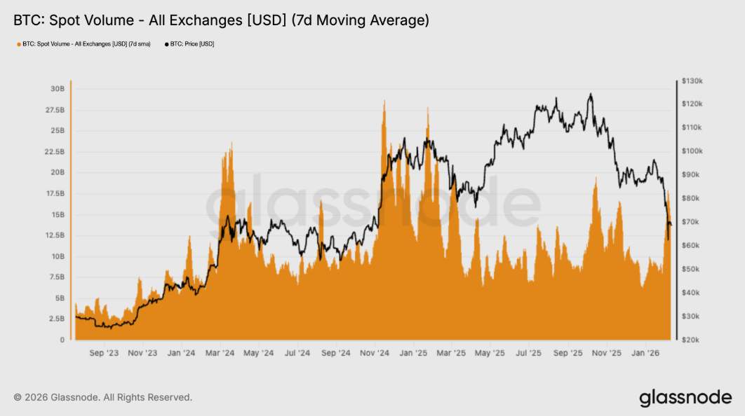 Bitcoin počas výpredaja do oblasti nízkych 70 000 dolárov zaznamenal prudký nárast spotových objemov. Sedemdňový kĺzavý priemer objemu výrazne vyskočil, keď volatilita zrýchlila. Tento pohyb však odrážal skôr reakciu na pokles než presvedčené nákupy.