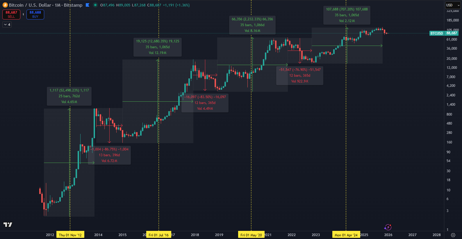 Porovnanie cyklov podľa údajov TradingView naznačuje, že október sa stal mesiacom, keď trh vytvoril lokálny alebo globálny vrchol. Z časového hľadiska tak došlo ku vrcholu presne v rovnakom čase od halvingu ako v prípade predošlých cyklov. Od historického maxima však klesla cena Bitcoinu v najnižšom bode o 36 %, čo stále patrí medzi štandardné korekcie. Skúsení obchodníci považujú za zásadné až poklesy okolo 50 % a viac.
