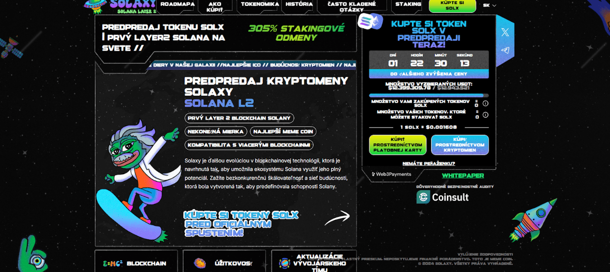 Zapojte sa do tohto revolučného projektu, ktorý odstraňuje nedostatky Solany. Cena Solaxy tokenu rastie v každej fáze predpredaja a jej aktuálna výška je 0,001608 dolára. Tokeny si kúpite platobnou kartou alebo kryptomenami ETH, BNB a SOL.