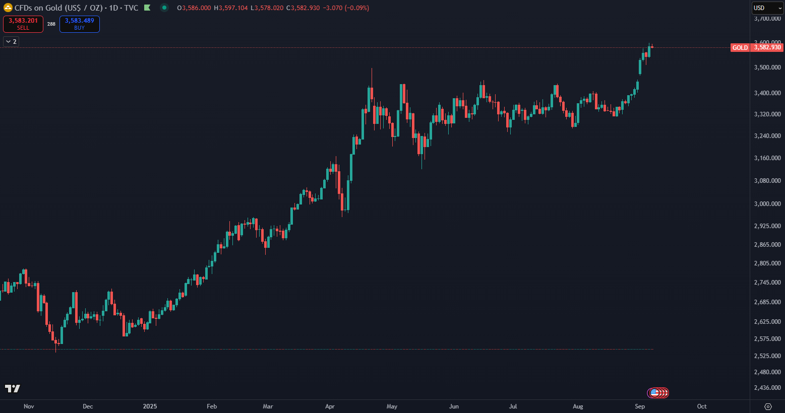 Zlato minulý týždeň podľa údajov TradingView vystrelilo na nové historické maximum, keď jeho cena prekonala 3 600 dolárov za uncu. Analytici dokonca tvrdia, že ďalšie rekordy sú nevyhnutné. Investori vnímajú tento nárast ako reakciu na očakávané znižovanie úrokových sadzieb v USA. Podľa údajov CME Group 90 % verí v zníženie o 0,25 % a 10 % až o 0,50 %.
