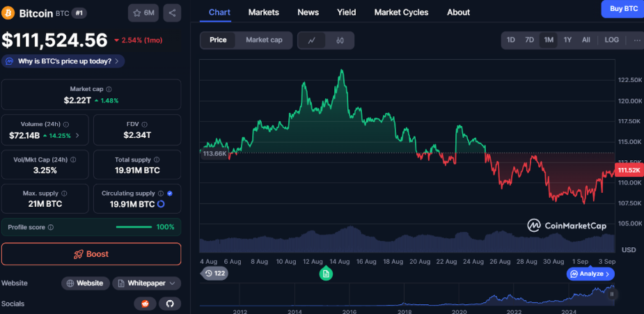 Bitcoin dosiahol v auguste nové historické maximum 124 457 dolárov, no jeho cena sa následne rýchlo prepadla pod 118 000 dolárov. Odvtedy cena Bitcoinu viac-menej stabilne klesala až k dnešným 111 500 dolárom, hoci na chvíľu otestovala aj úroveň 107 300 dolárov.