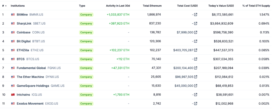 Ethereum treasury spoločnosti tak akumulujú ETH čoraz rýchlejšie, čím prispievajú k silnému dopytu. Firma BitMine drží už vyše 1,8 milióna ETH za približne 8,2 miliardy dolárov, no jej cieľom je vlastniť až 5 % celkovej zásoby. Spoločnosť SharpLink Gaming zvýšila za posledný týždeň svoju rezervu o viac ako 39 tisíc ETH na 837 230 ETH a zo stakingových odmien si vytvára nový zdroj príjmu.