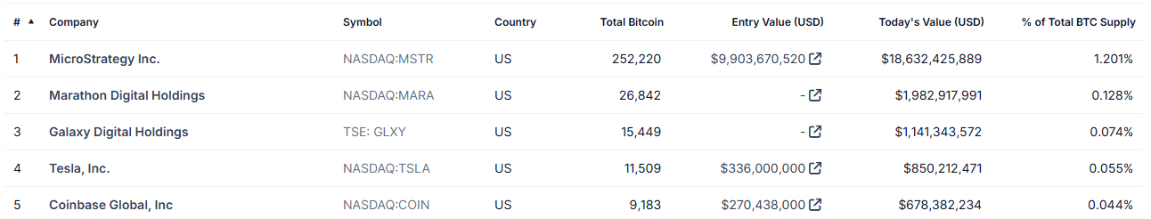 Najväčšie verejne obchodované firmy podľa držieb Bitcoinov. Zdroj: Coingecko