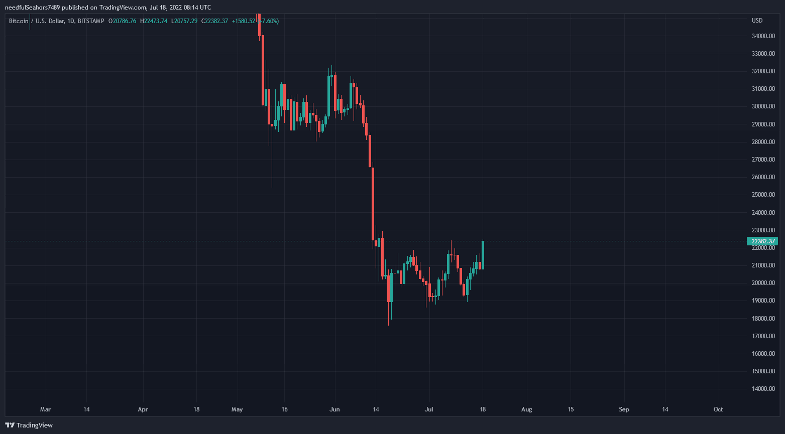 Bitcoin sa v čase písania článku obchoduje za 22 300 dolárov a niekoľko hodín po sebe jeho cena rastie. Výrazné objemy však stále chýbajú, čo nepotvrdzuje masovú chuť nakupovať v súčasných podmienkach.