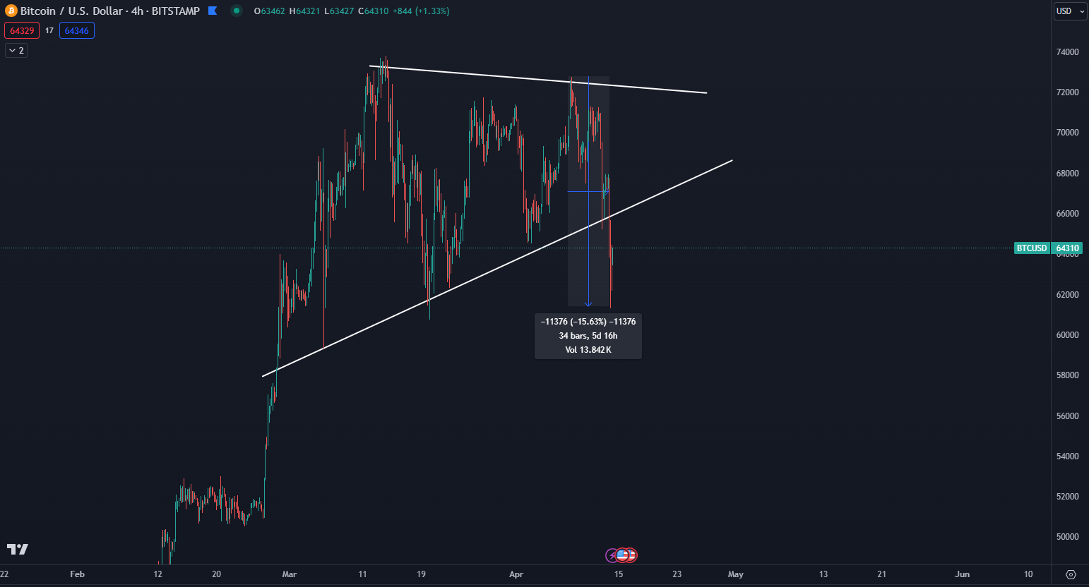 Najväčšia kryptomena na svete vypadla z bočnej štruktúry, ktorá trvala od začiatku marca a napokon neudržala support. Cena sa zrútila a stiahla so sebou celý trh. Ťažko posúdiť, čo bolo skutočným dôvodom, no mnohí pripisujú tento pokles napadnutiu Izreaela zo strany Iránu.
