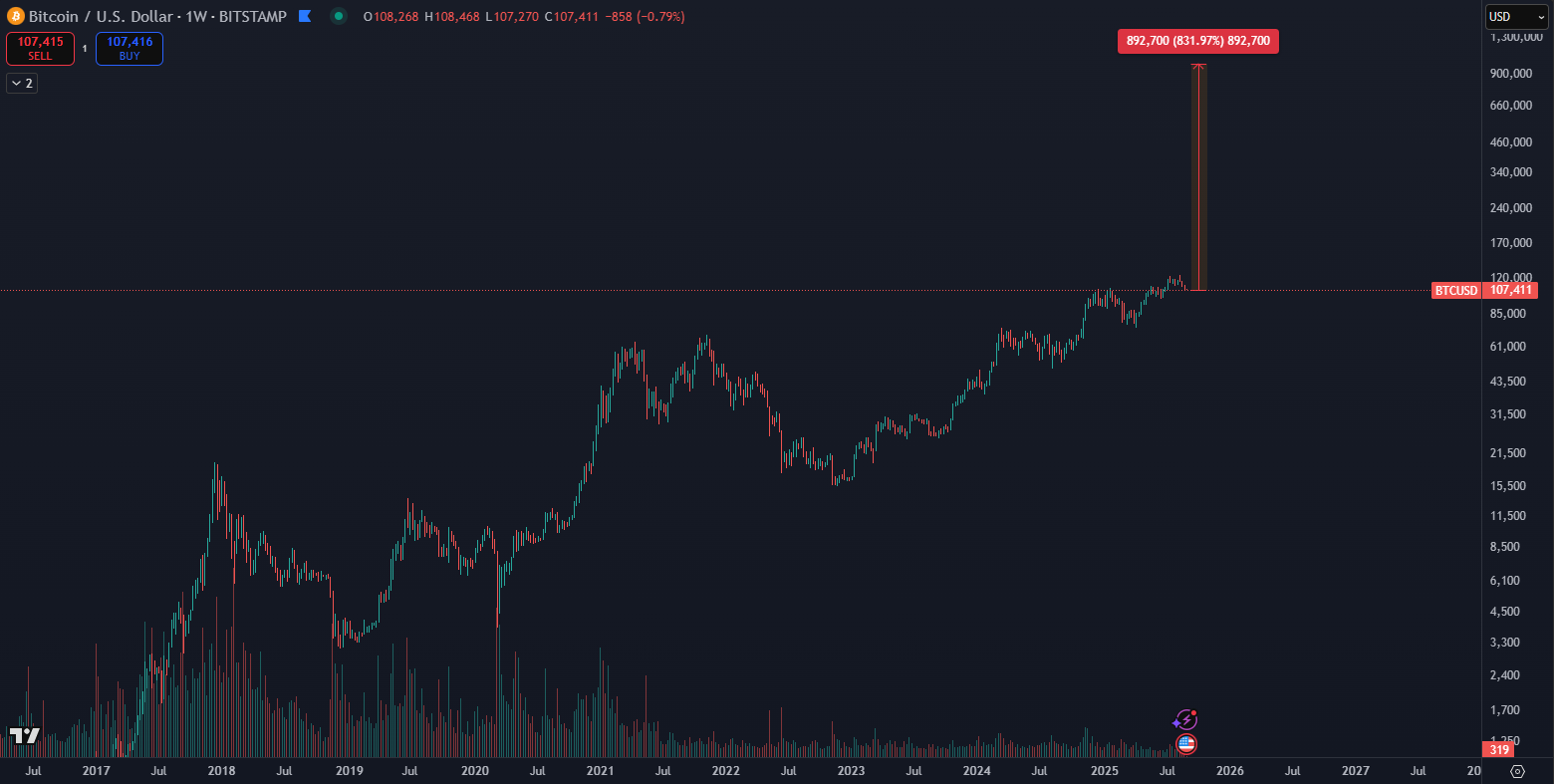 Podľa údajov platformy TradingView by musel BTC vzrásť zo svojej súčasnej úrovne približne o 832 %, aby sa dostal na hranicu jedného milióna dolárov. Takýto rast by predstavoval historický míľnik nielen pre kryptomeny, ale aj pre celosvetový finančný systém a investorov.
