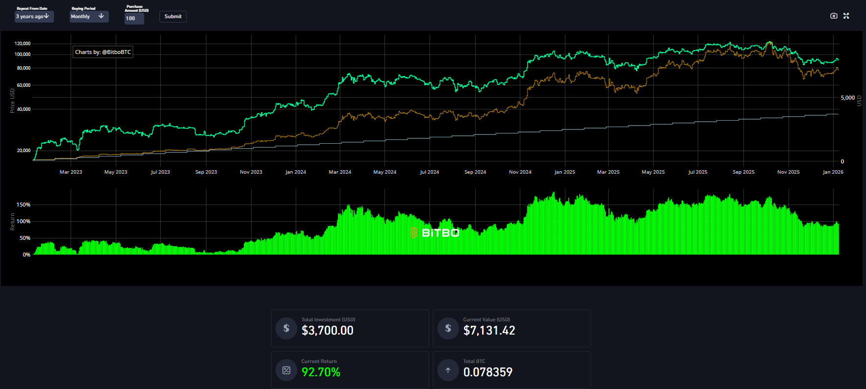 Bitcoin prináša fascinujúce výsledky pre tých, ktorí investujú pravidelne. Podľa údajov z Bitbo Charts, interaktívneho DCA nástroja pre Bitcoin, sme analyzovali výsledky pravidelného investovania 100 eur mesačne po dobu 36 mesiacov.