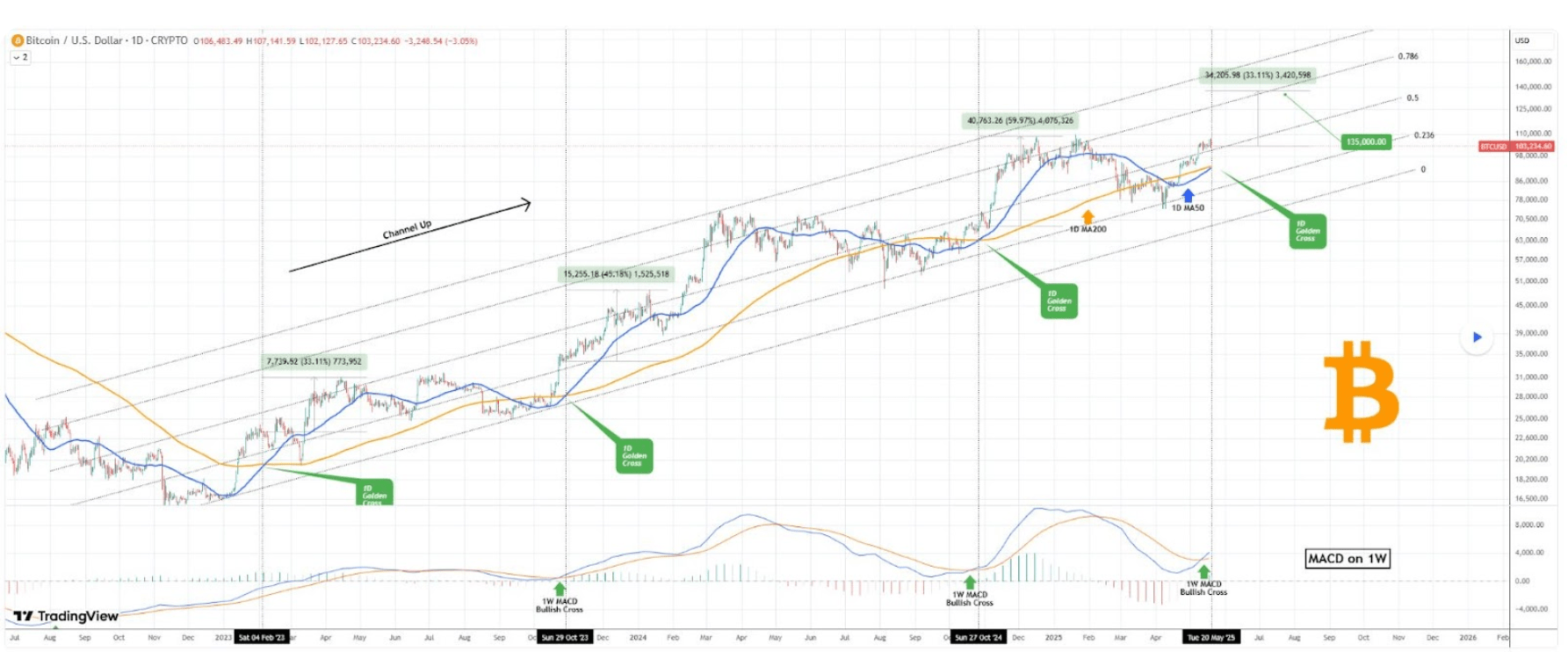 K javu zlatého kríža dochádza vtedy, keď 50-dňový kĺzavý priemer prerazí nad 200-dňový kĺzavý priemer. História ukazuje, že každý takýto moment v posledných dvoch a pol rokoch viedol k prudkému rastu – najnižší zaznamenaný rast bol až 33,11 %. Analýza platformy TradingView naznačuje, že ďalší cieľ ceny sa nachádza práve na úrovni 135 000 dolárov, čo sa zhoduje s úrovňou 0,236 Fibonacciho retracementu. Na túto analýzu už skôr upozornil analytik TradingShot.