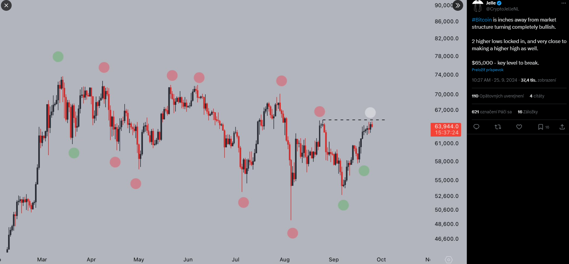 Vzhľadom na nedávne cenové nárasty kryptomeny, analytik Jelle vyhlásil, že trhová štruktúra Bitcoinu je blízko k opusteniu klesajúceho trendu a úplnému prechodu na rastúci trend. Odhalil, že najväčšia kryptomena už dosiahla dva vyššie minimá a blíži sa k dosiahnutiu vyššieho maxima.