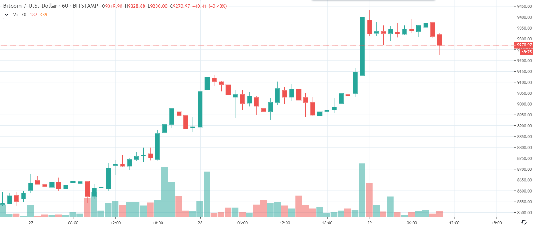 Bitcoin v priebehu necelých dvoch hodín zaznamenal rast o 400$. Z hladiny 9000 $ vyskočil až na 9400 $. Nové tohtoročné high máme na cene 9430 $. Aktuálne sa BTC obchoduje za 9300 – 9350 $.