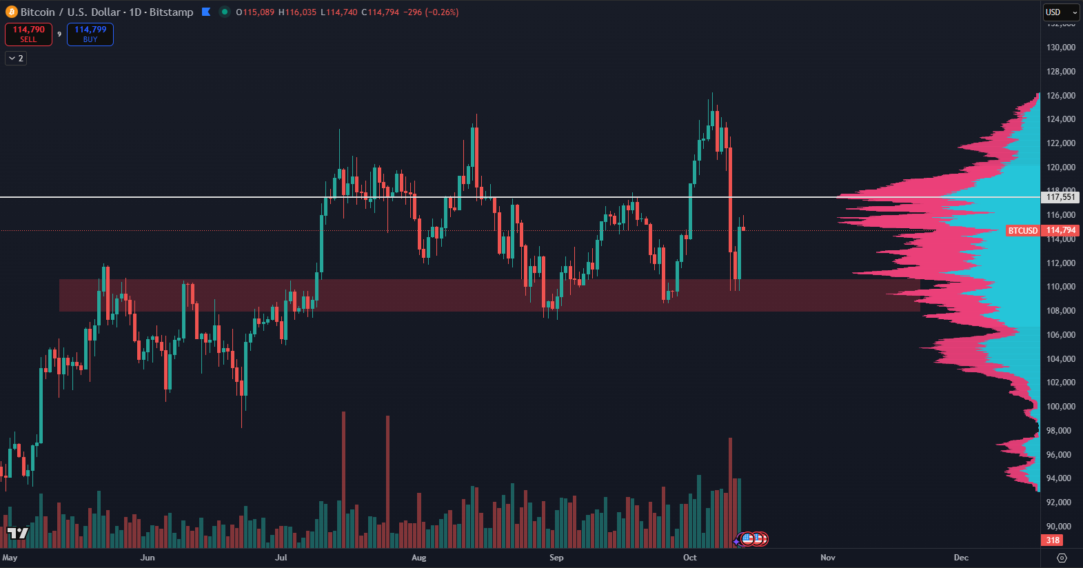 Po prudkom poklese nastal rýchly odraz na súčasnú úroveň približne 114 794 dolárov, čo je typické správanie po silných korekciách. Takéto odrazy bývajú často len krátkodobé a treba sledovať, či majú dostatočnú silu na udržanie ceny nad hranicou 110 000 dolárov. Aj keď technická analýza momentálne neukazuje zmenu trendu, dynamika trhu naznačuje zvýšenú neistotu.