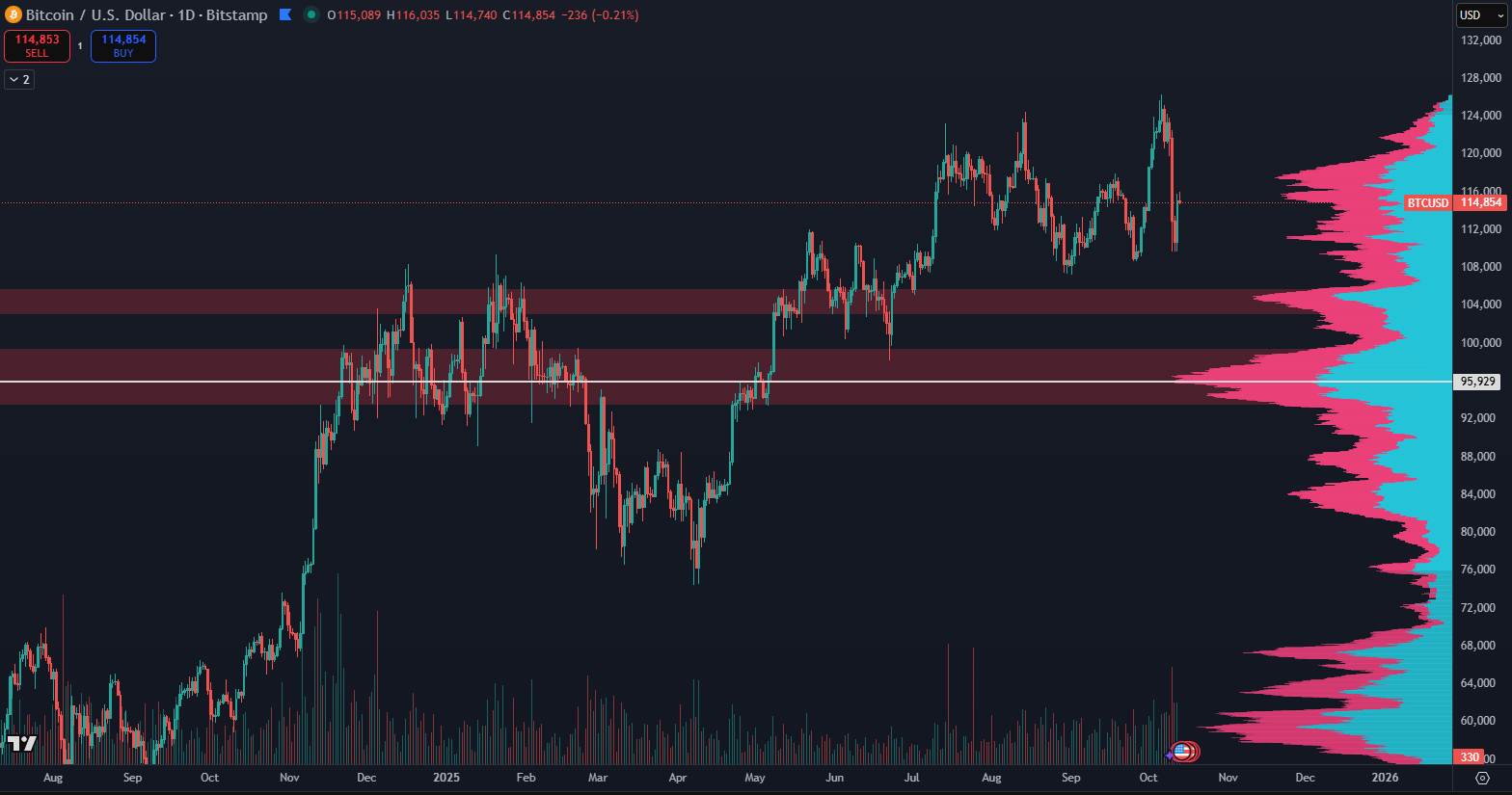 Cena Bitcoinu sa pohybuje v bočnom pásme medzi historickým maximom a podporou okolo 109 000 dolárov. Najbližšie sledované zóny s výraznou aktivitou investorov sa nachádzajú medzi 106 000 až 103 000 dolármi a nižšie v pásme 99 000 až 93 000 dolárov. V týchto oblastiach sa historicky koncentrovali najväčšie objemy obchodov, čo ich robí silnými úrovňami podpory.