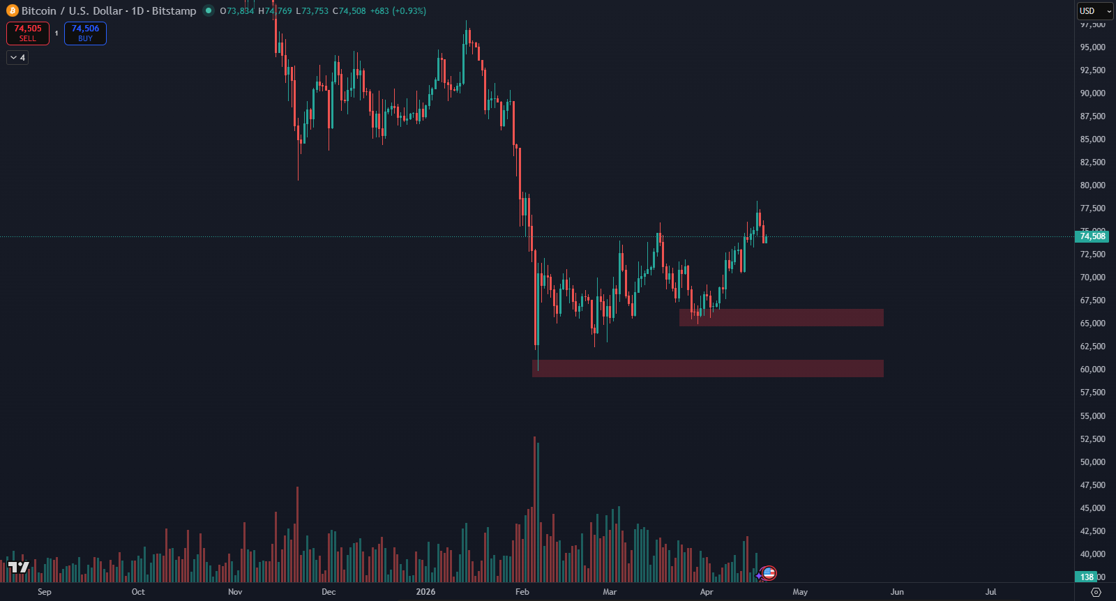 Najväčšia kryptomena napokon prekonala rezistenciu, ktorú tvorili maximá predchádzajúcej korekcie. Táto bývalá bariéra pozostávala z historického maxima a lokálneho maxima z polovice januára tohto roku. K samotnému prerazeniu klesajúcej trendovej čiary dochádzalo už počas 13. apríla, avšak spočiatku sme nevedeli určiť, či ide o falošný prieraz. Neistota zmizla až vo chvíli, keď cena stúpla nad 78 000 dolárov, čím trh tento zlom potvrdil. Napriek tomuto úspechu však digitálne zlato stále nezmenilo svoj dlhodobý trend, čo vnáša do analýzy dávku opatrnosti.
