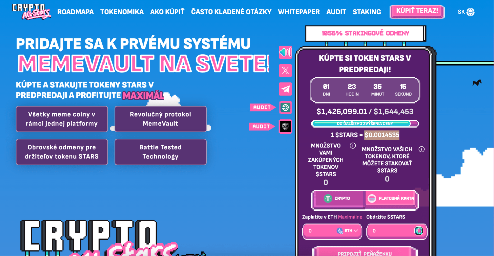Tokeny STARS sú dnes k dispozícii za 0,0014887 dolára. Zakúpiť sa dajú priamo na oficiálnej stránke projektu prostredníctvom integrovaného widgetu, ktorý akceptuje ETH, BNB, USDT a platobné karty. Dodnes sa na Crypto All-Stars vyzbieralo viac než 2 milióny dolárov.