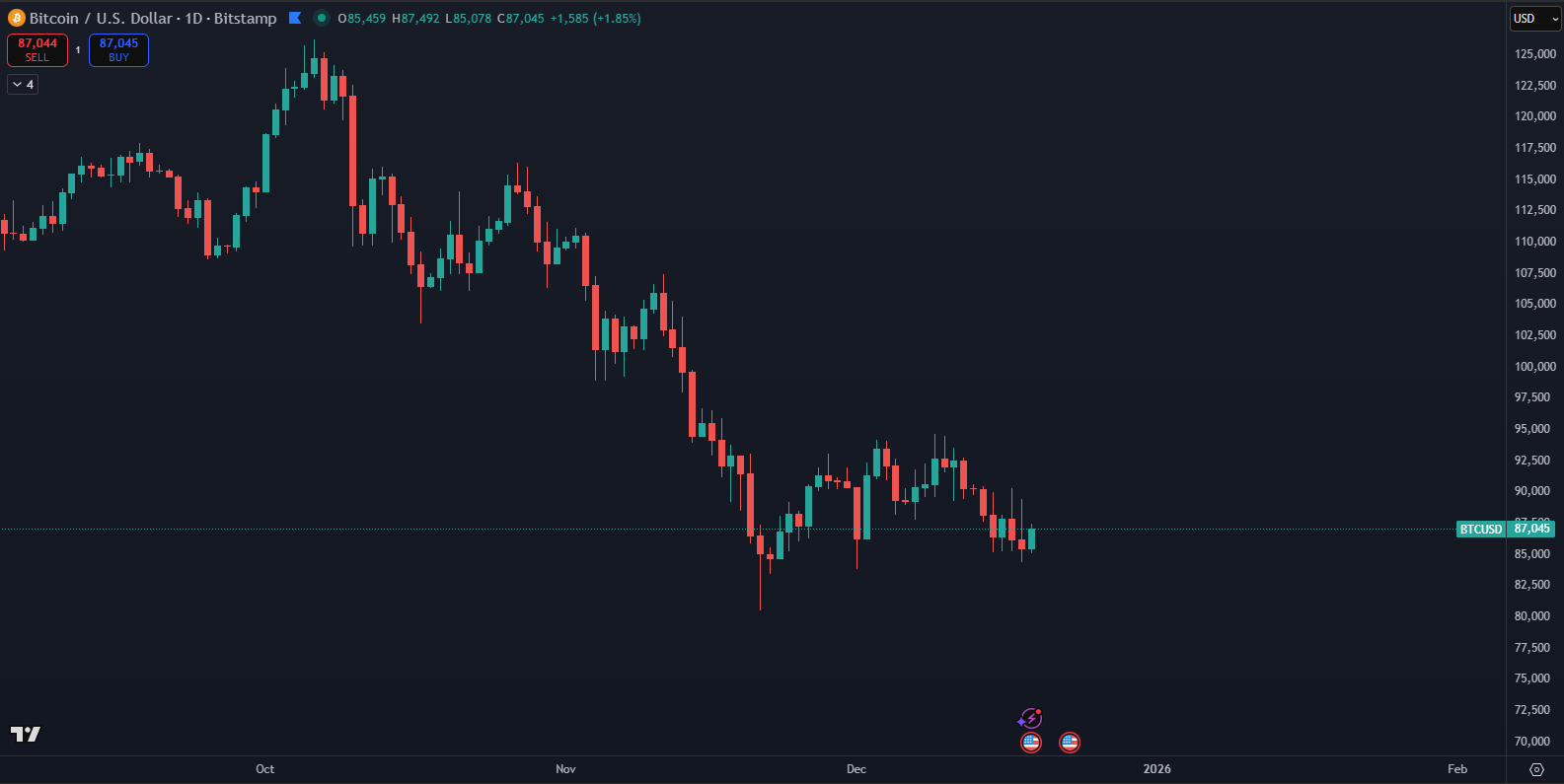 V čase zverejnenia dát sa Bitcoin podľa TradingView obchodoval približne na úrovni 87 000 dolárov, pričom za posledných 24 hodín posilnil o 1,87 %. Napriek nedávnemu poklesu stredne veľkí držitelia nečakali na jasný rastový impulz. Naopak, využili krátkodobú slabosť ceny na navýšenie expozície. Tento prístup kontrastuje s typickým správaním retailu, ktorý často vstupuje do trhu až pri prudkom raste.