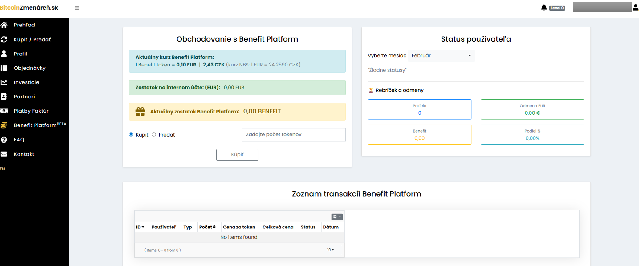 Platforma benefitov na BitcoinZmenáreň predstavuje interný systém odmien, ktorý používateľom umožňuje nakupovať a spravovať špeciálne benefit tokeny priamo v účte. Používatelia vidia aktuálny kurz tokenu voči euru, svoj zostatok aj históriu transakcií na jednom mieste. Platforma zároveň ponúka prehľad statusu používateľa, rebríček pozícií a potenciálne odmeny, ktoré môže klient získať podľa aktivity alebo zapojenia do programu.