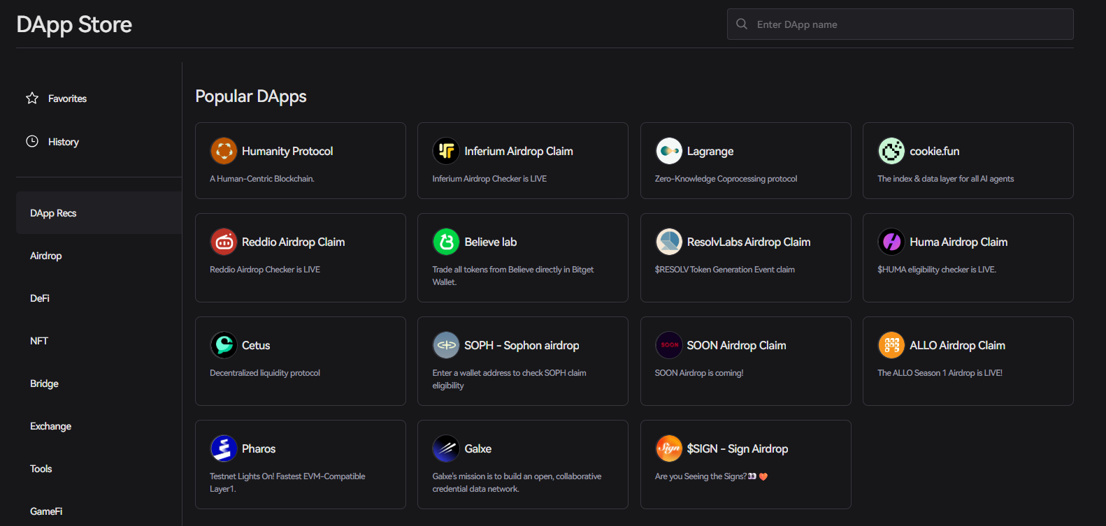 DApp: DApp prehliadač v Bitget Web3 umožňuje používateľom prístup k stovkám decentralizovaných aplikácií priamo z peňaženky. Zahŕňa DeFi platformy, NFT trhy, decentralizované burzy a blockchainové hry. Vďaka podpore viacerých reťazcov si používatelia môžu jednoducho vybrať aplikáciu podľa preferovanej siete. Bezpečnostné prvky chránia pred podvodnými aplikáciami a zároveň zabezpečujú plynulé a dôveryhodné spojenie s Web3 službami.