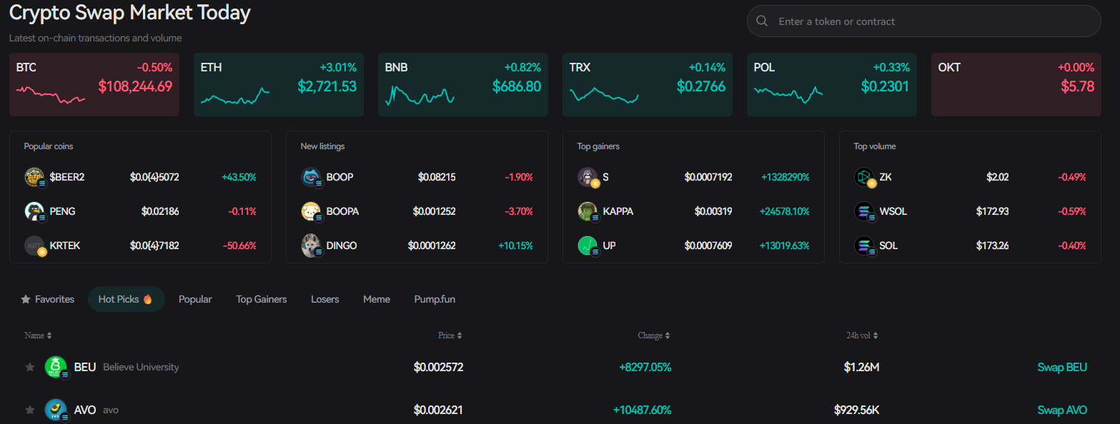 Markets: Služba Markets v rámci Bitget Web3 ponúka prehľadný nástroj na sledovanie cien kryptomien, analýzu trendov a správu portfólia. Používatelia môžu sledovať vývoj cien tokenov v reálnom čase, vyhľadávať nové tokeny a analyzovať ich likviditu a aktivitu na rôznych sieťach. Táto funkcionalita je integrovaná priamo do Bitget Wallet, čím umožňuje jednoduché obchodovanie a zámenu tokenov bez nutnosti opustiť aplikáciu.