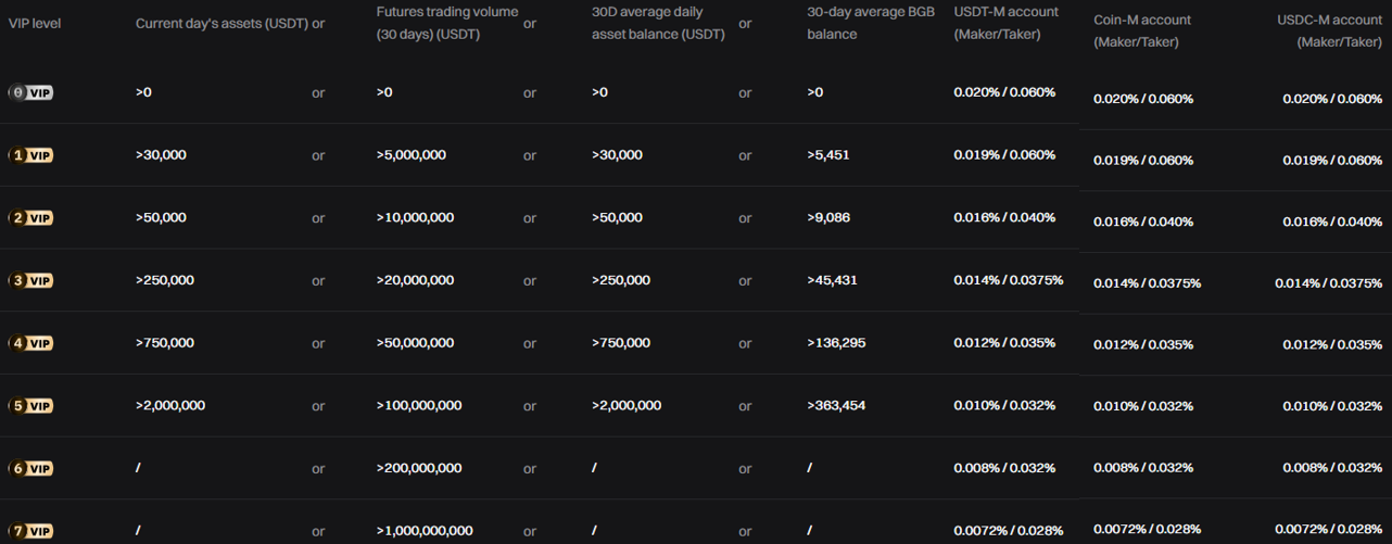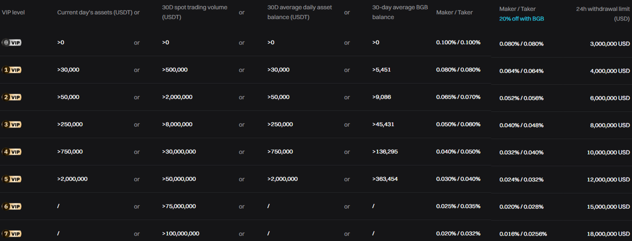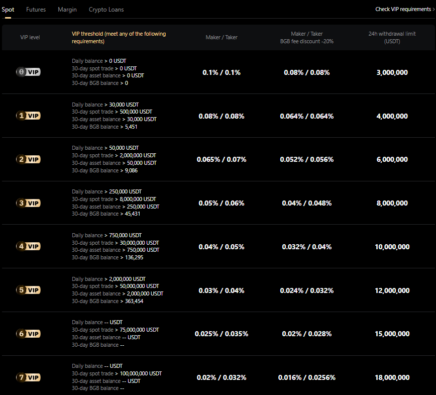 - Pri spotovom obchodovaní je základný maker poplatok 0,1 % a taker poplatok taktiež 0,1 %. Používatelia môžu tieto sadzby znížiť vyšším VIP levelom, ktorých je dokopy až 7, alebo držaním tokenu BGB, čím získate zľavu 20 %.