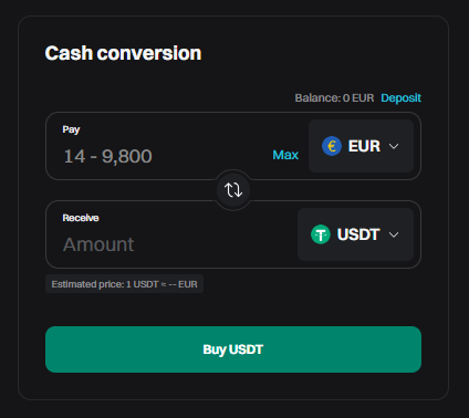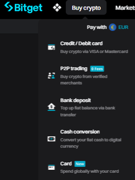 - Konverzia peňazí (fiat a krypto): V rozhraní Bitget možno fiat menu (napr. eurá) okamžite konvertovať na kryptomenu pomocou služby zmenárne. Tento spôsob zahŕňa platbu kartou alebo bankovým prevodom.