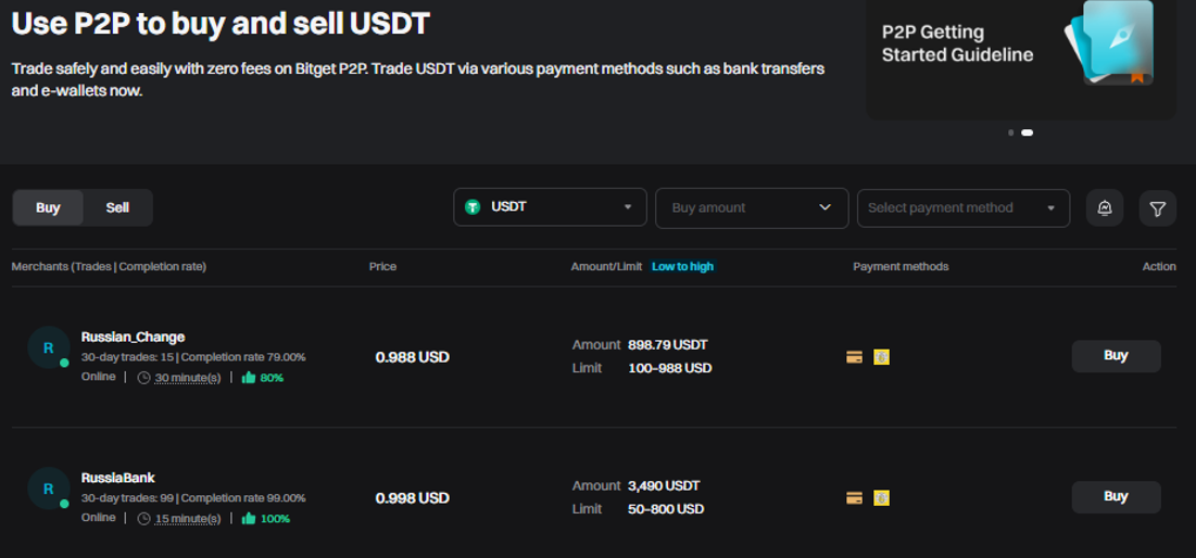 - P2P trading: Bitget umožňuje peer to peer obchodovanie, kde si môžete kúpiť kryptomeny priamo od iných používateľov cez platobné metódy ako bankový prevod, Revolut, Wise, atď. Táto možnosť je bez poplatkov a často výhodná z hľadiska kurzu.