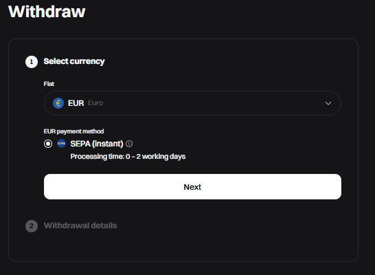 Burza Bitget umožňuje používateľom vybrať prostriedky prostredníctvom viacerých kanálov. Pre výbery v eurách je k dispozícii SEPA bankový prevod, pri ktorom je účtovaný fixný poplatok 1 euro. Minimálna suma pre výber je 10 eur, pričom maximálny limit na jednu transakciu je 15 000 eur. Transakcie sú spracované zvyčajne do 1–2 pracovných dní.