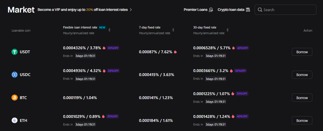 - Crypto Loans: Umožňuje používateľom získať pôžičku v stablecoinoch alebo iných aktívach výmenou za zábezpeku vo forme kryptomien. Tento produkt je ideálny pre investorov, ktorí nechcú predávať svoje držané kryptomeny, ale potrebujú likviditu napríklad na ďalšie investície alebo spotrebu.