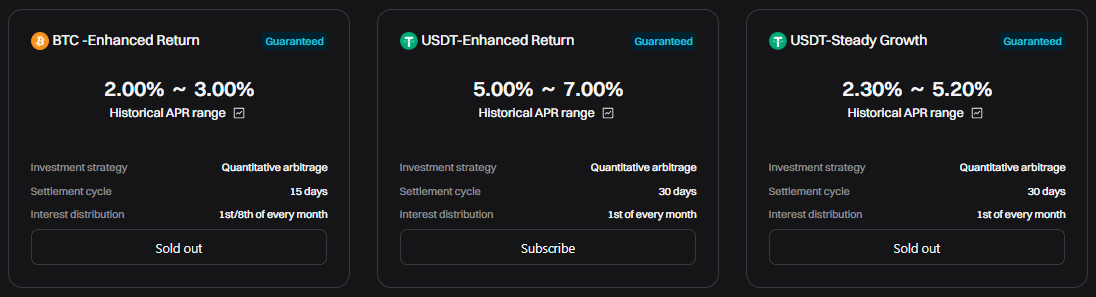 - Smart Trend: Algoritmicky riadený produkt, ktorý automaticky investuje do trendových kryptomien alebo stratégií podľa analýzy trhu. Cieľom je maximalizovať výnosy sledovaním pohybov na trhu. Je vhodný pre používateľov, ktorí chcú výnosy bez potreby manuálneho riadenia portfólia.